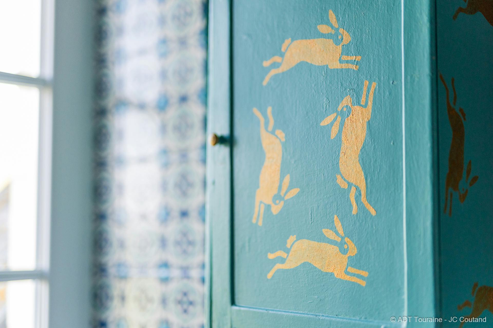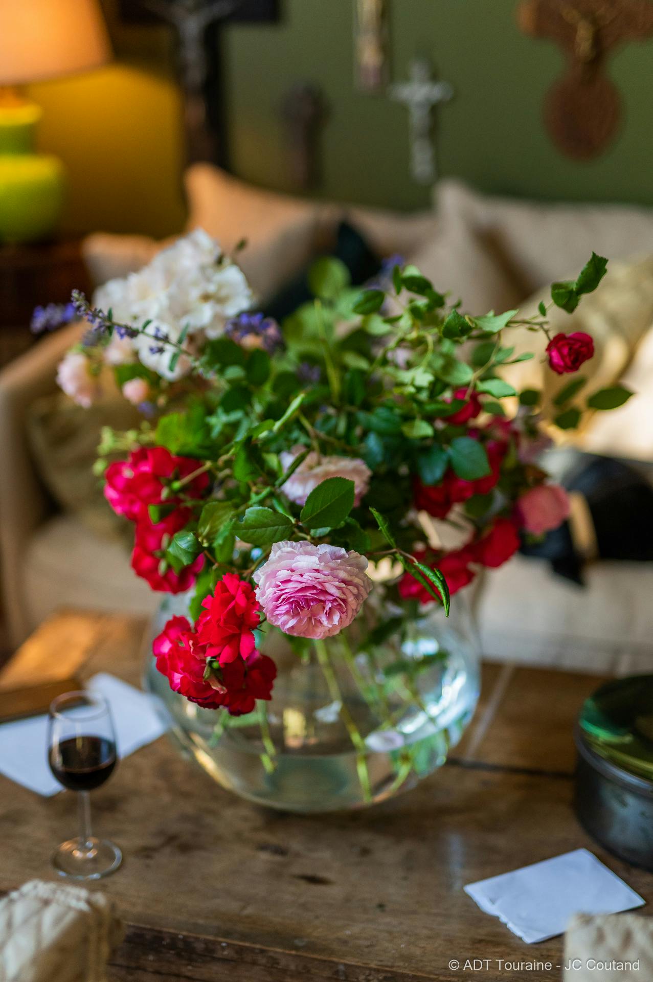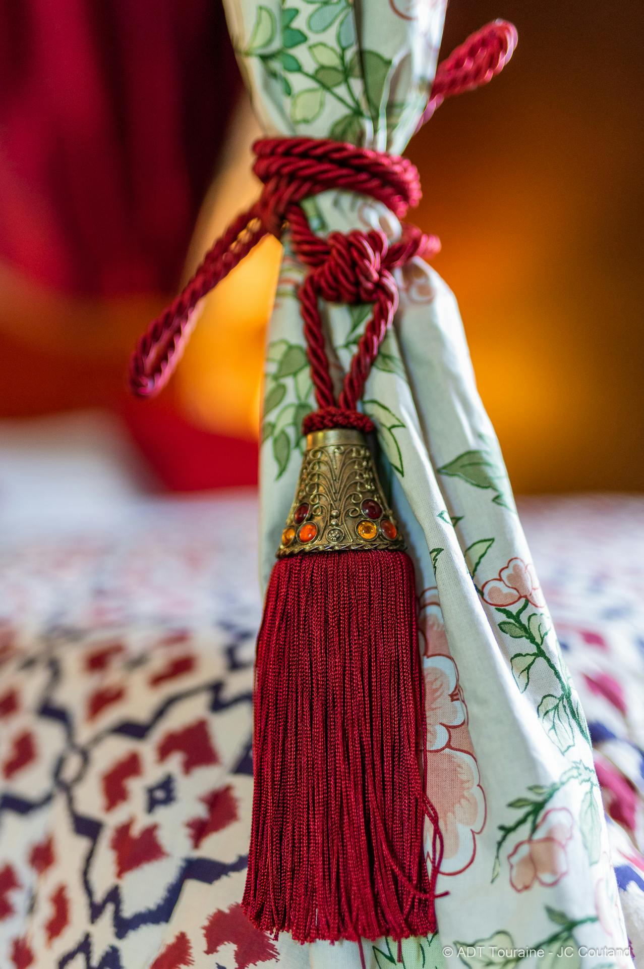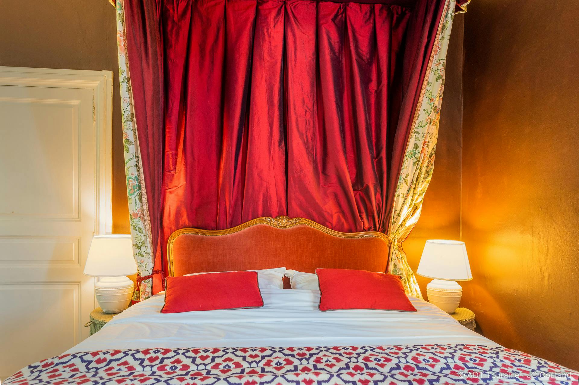 This wonderful bedroom is on the first floor of the manor house. A grand velvet four poster bed (160m wide), hung with silk fabrics and curtains dominates the room. Lots of persian rugs cover the floor and the original white marble fireplace is intact. A large sofa and two Louis XVI velvet armchairs provide a spacious seating area. An antique chest of drawers and a large French armoire (wardrobe) dress the room. Ensuite bathroom with bath. The bedroom overlooks the terraced gardens at the back (north facing) and the front courtyard with its majestic lime trees (south side). Private access to a decked terrace overlooking the gardens. Organic artisanal toiletries from local soap maker.