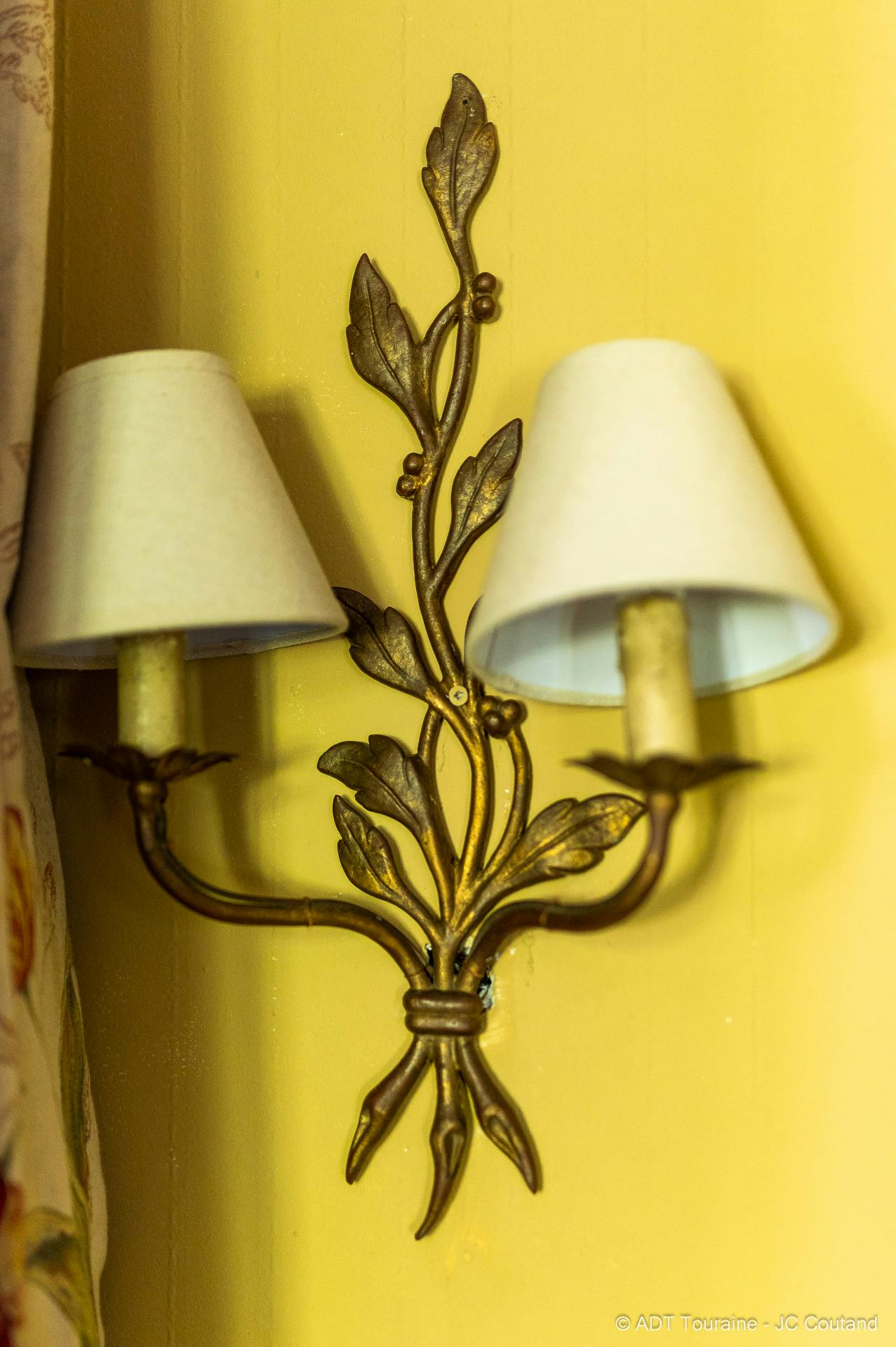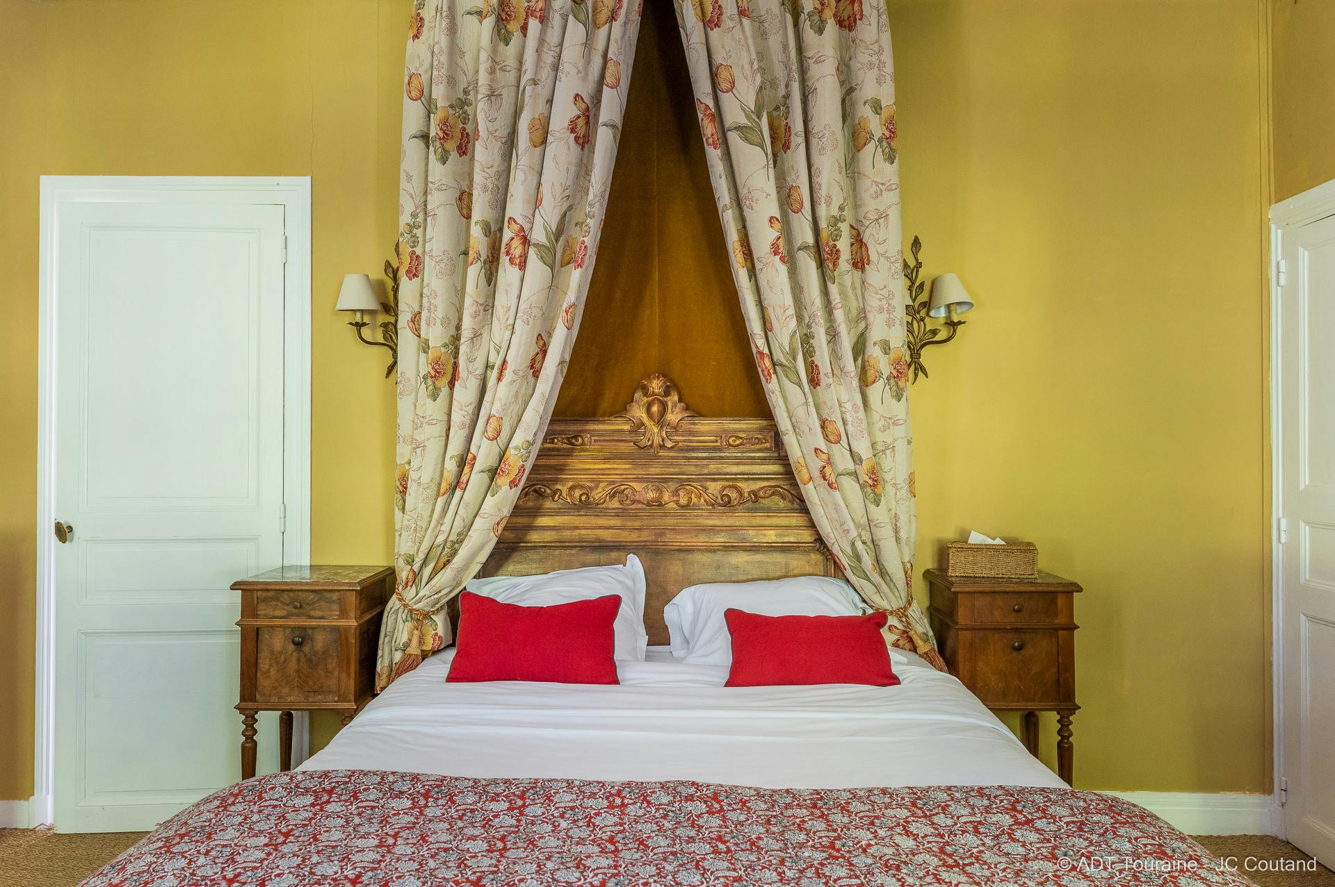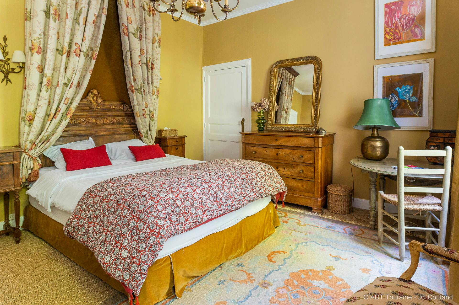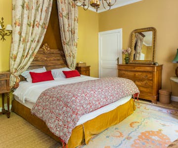 This pretty south facing bedroom is on the first floor of the manor house, looking out onto a canopy of lime trees. The room is airy and light filled. Furnished with a large double bed (160m wide) dressed with an embroidered silk bed canopy and antique oak bed-head.