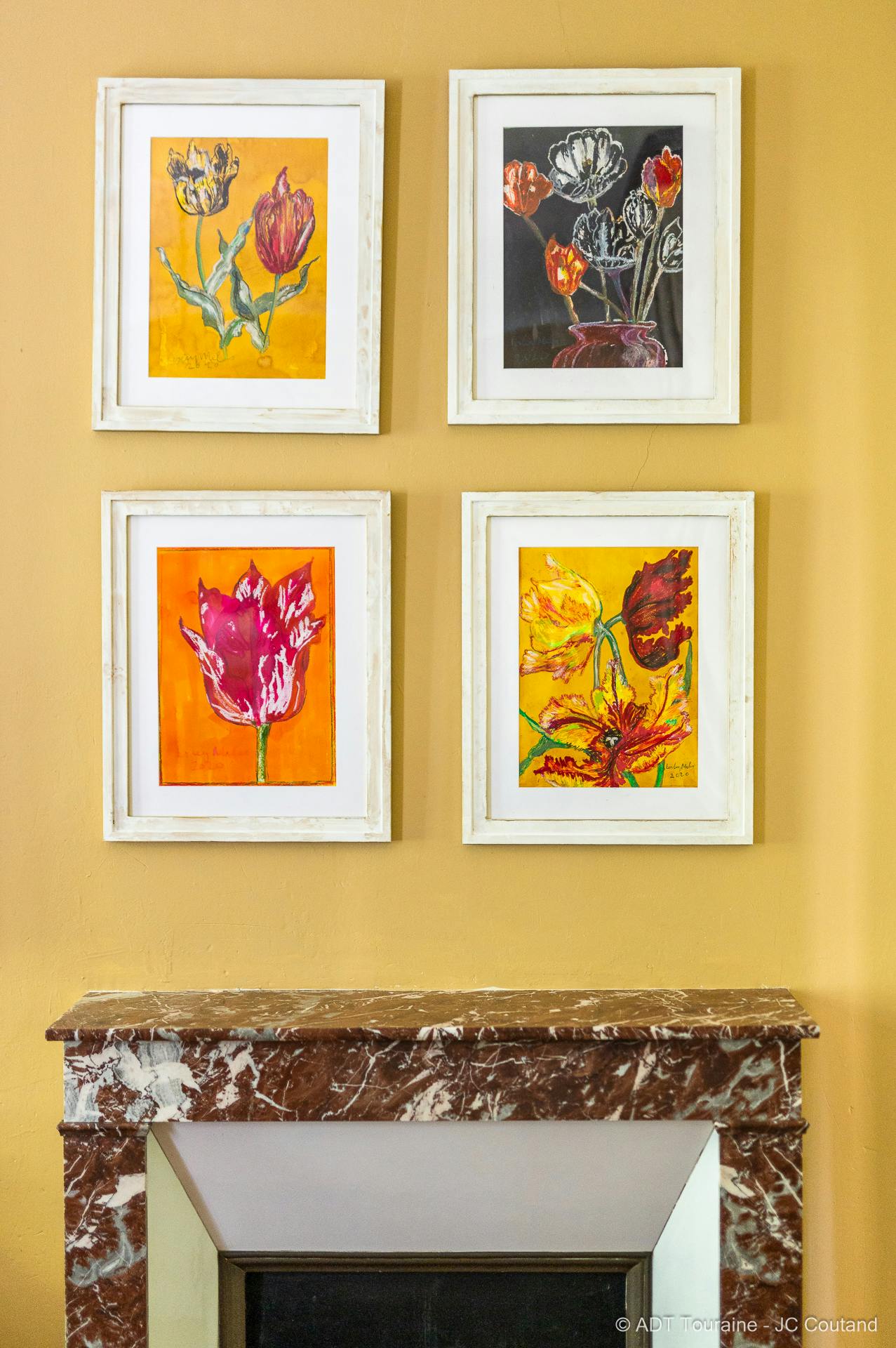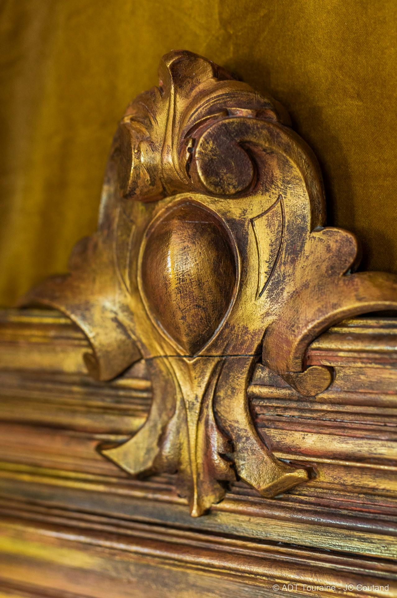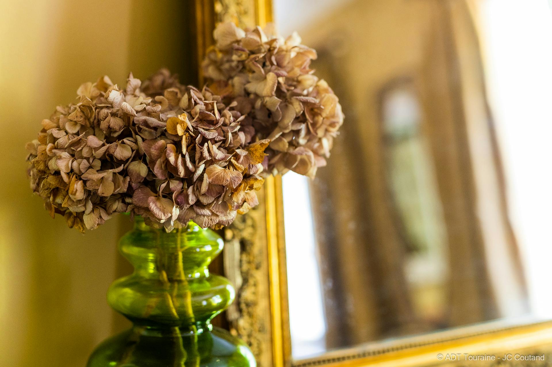 This pretty south facing bedroom is on the first floor of the manor house, looking out onto a canopy of lime trees. The room is airy and light filled. Furnished with a large double bed (160m wide) dressed with an embroidered silk bed canopy and antique oak bed-head.